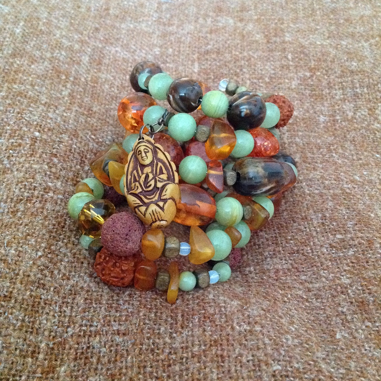 Acompañada con cuentas de múltiples colores y materiales en terracota, cuarzo color ámbar.